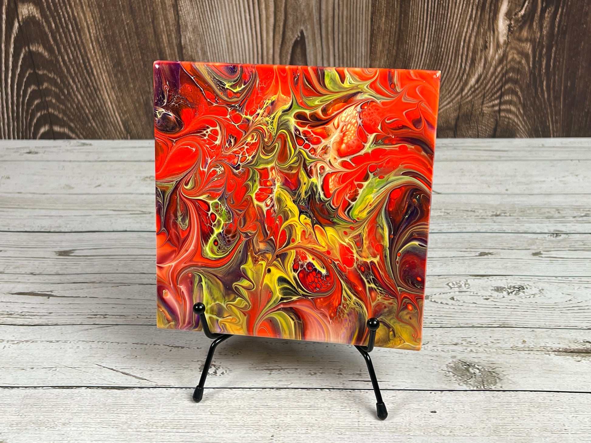 This handmade trivet is one-of-a-kind. It will bring a burst of color and elegance to any kitchen countertop, dining or end table. Excellent as a base for a plant, candle or vase, or you can simply display it with the included metal stand.
