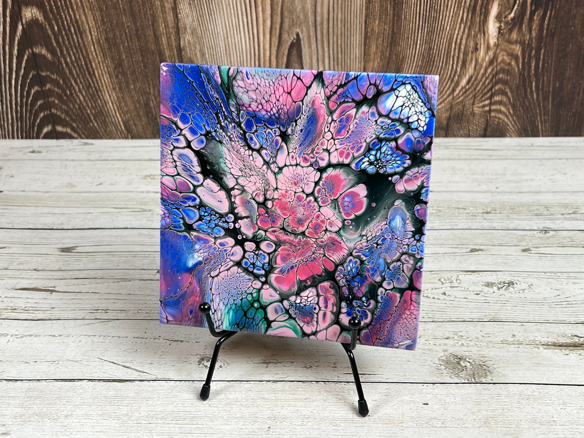 This handmade trivet is one-of-a-kind. It will bring a burst of color and elegance to any kitchen countertop, dining or end table. Excellent as a base for a plant, candle or vase, or you can simply display it with the included metal stand.