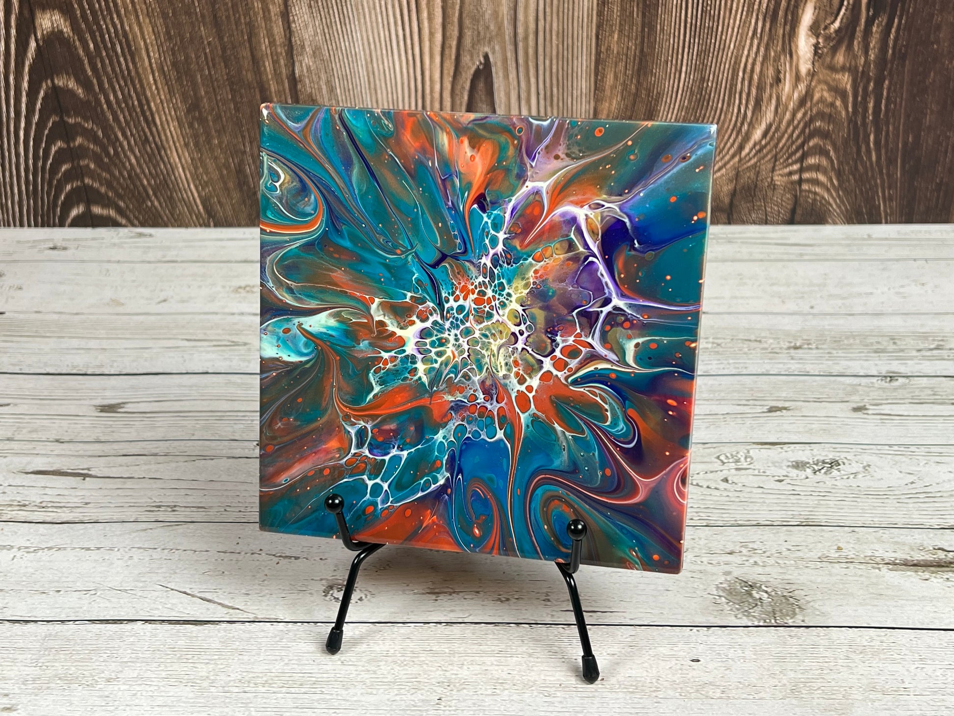 This handmade trivet is one-of-a-kind. It will bring a burst of color and elegance to any kitchen countertop, dining or end table. Excellent as a base for a plant, candle or vase, or you can simply display it with the included metal stand.