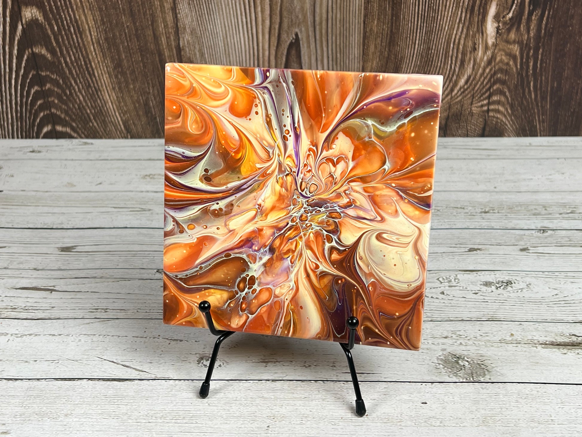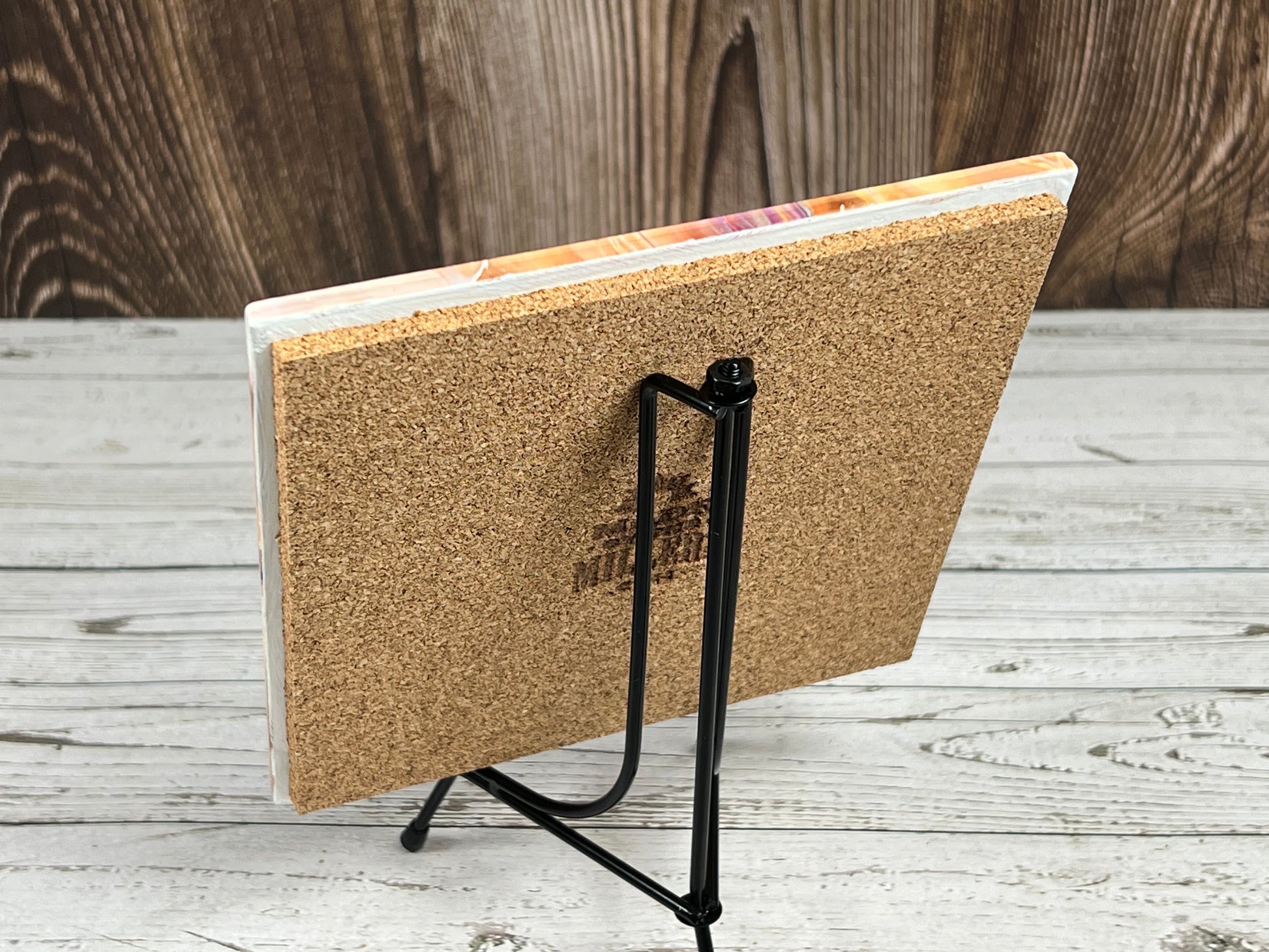 This handmade trivet is one-of-a-kind. It will bring a burst of color and elegance to any kitchen countertop, dining or end table. Excellent as a base for a plant, candle or vase, or you can simply display it with the included metal stand.