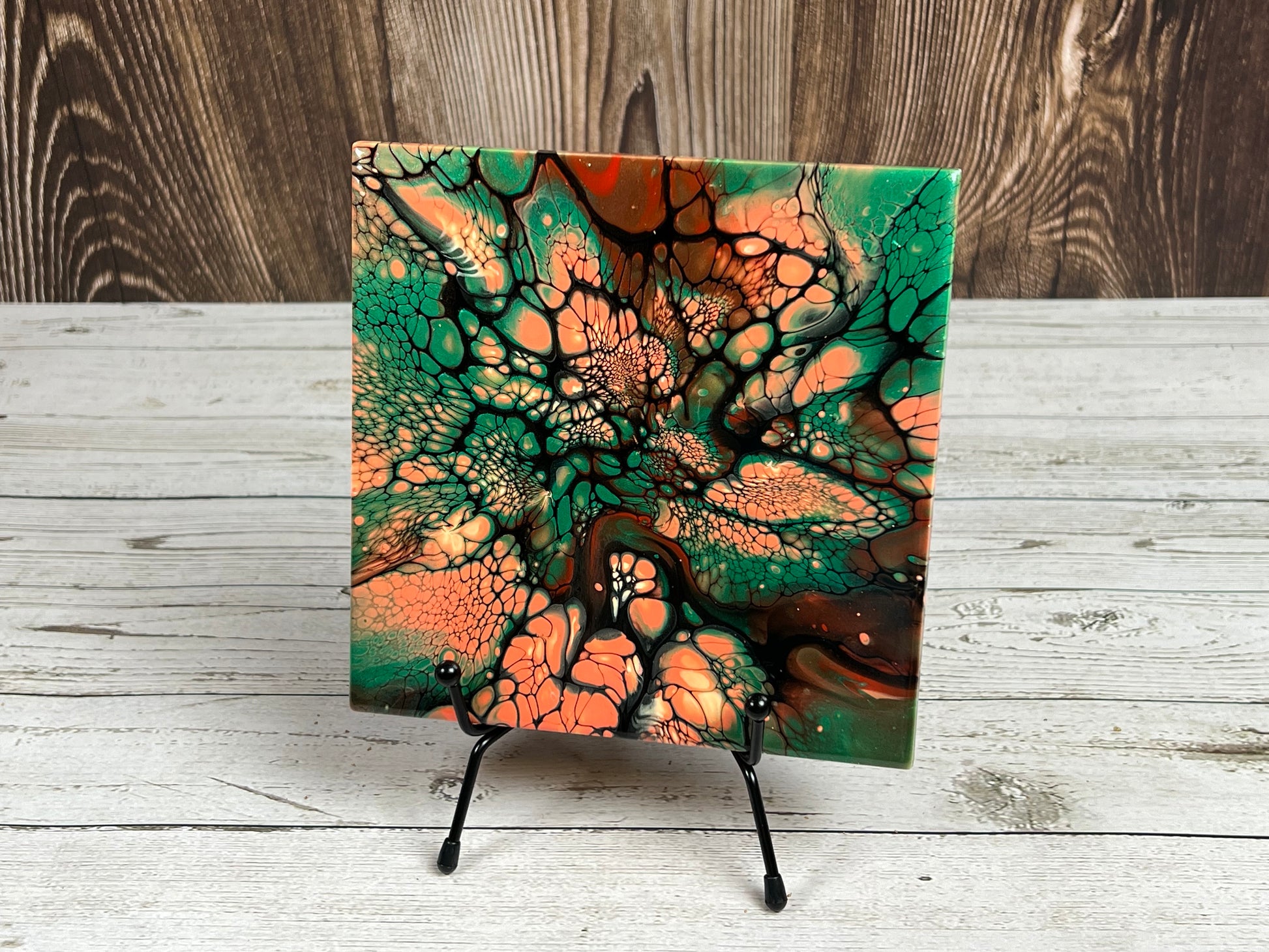 This handmade trivet is one-of-a-kind. It will bring a burst of color and elegance to any kitchen countertop, dining or end table. Excellent as a base for a plant, candle or vase, or you can simply display it with the included metal stand.