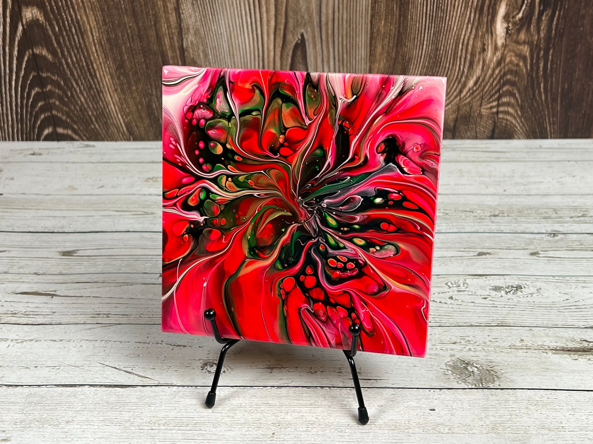 This handmade trivet is one-of-a-kind. It will bring a burst of color and elegance to any kitchen countertop, dining or end table. Excellent as a base for a plant, candle or vase, or you can simply display it with the included metal stand.