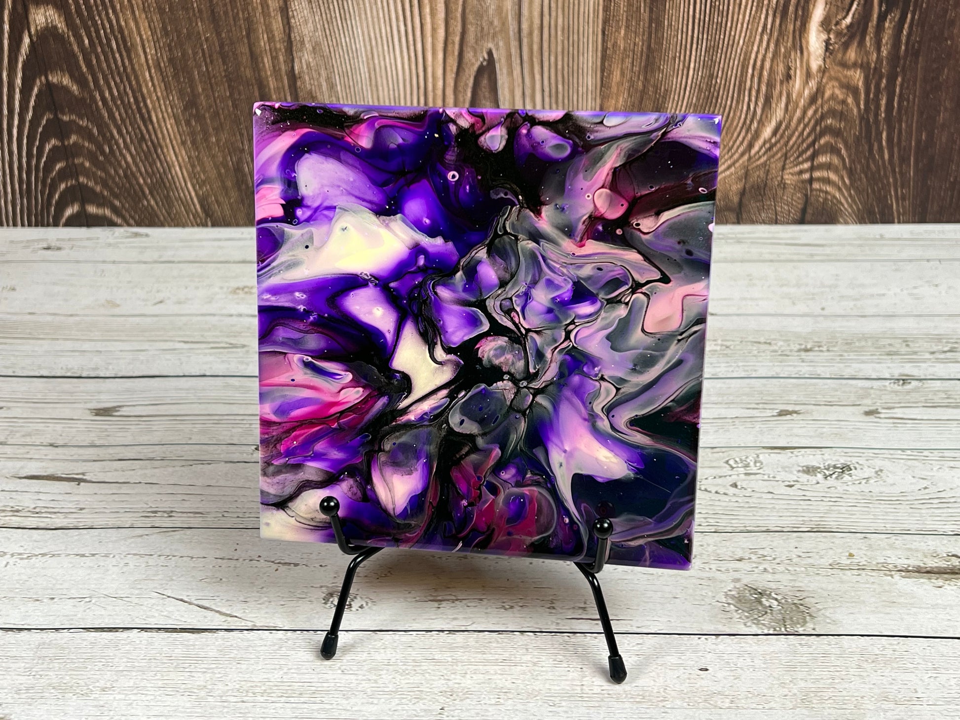 This handmade trivet is one-of-a-kind. It will bring a burst of color and elegance to any kitchen countertop, dining or end table. Excellent as a base for a plant, candle or vase, or you can simply display it with the included metal stand.