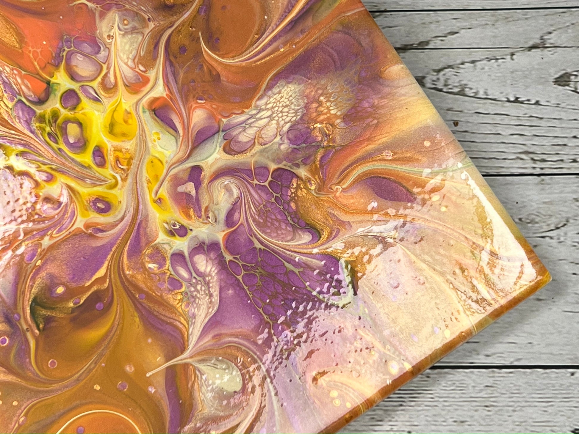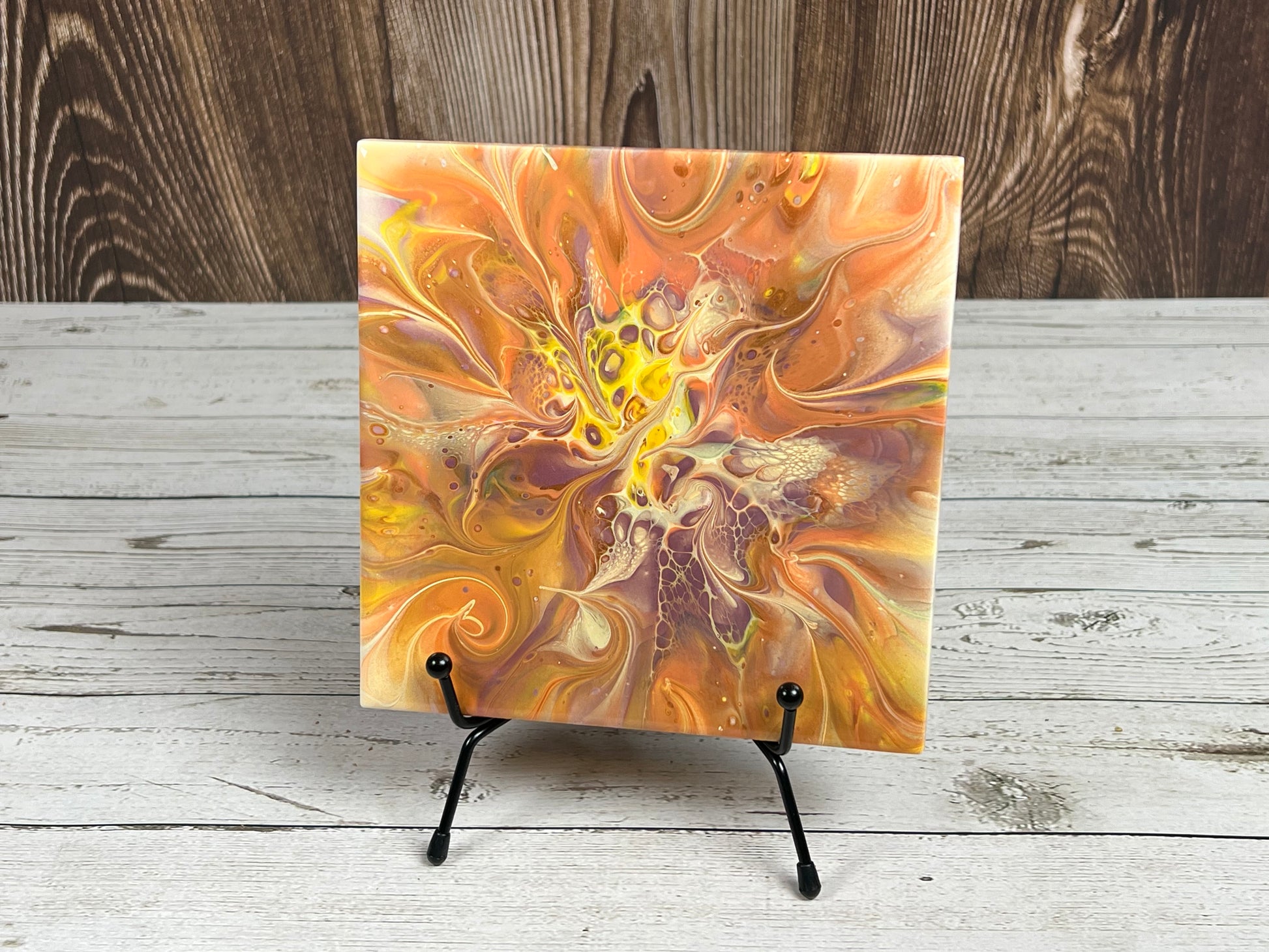 This handmade trivet is one-of-a-kind. It will bring a burst of color and elegance to any kitchen countertop, dining or end table. Excellent as a base for a plant, candle or vase, or you can simply display it with the included metal stand.