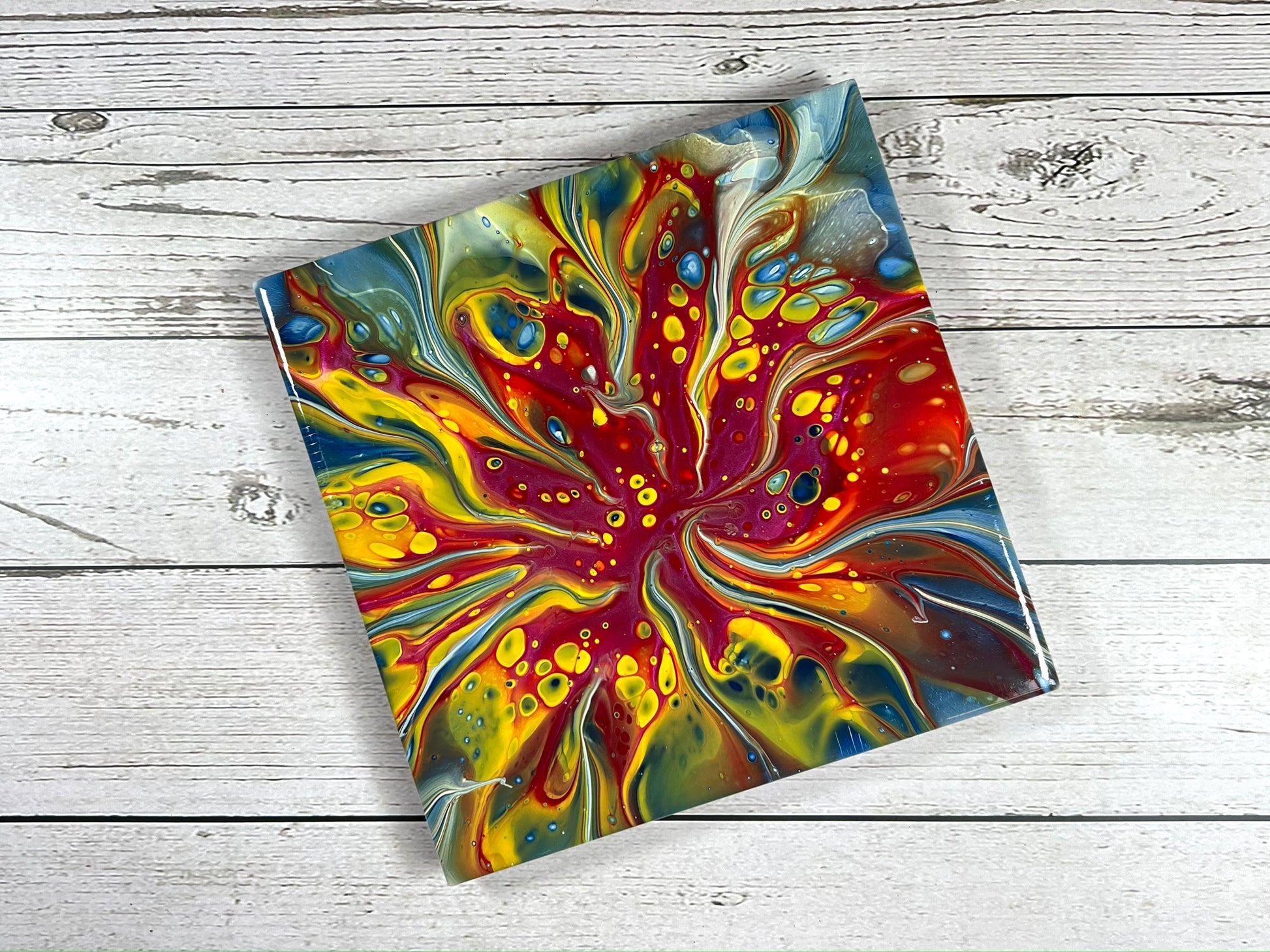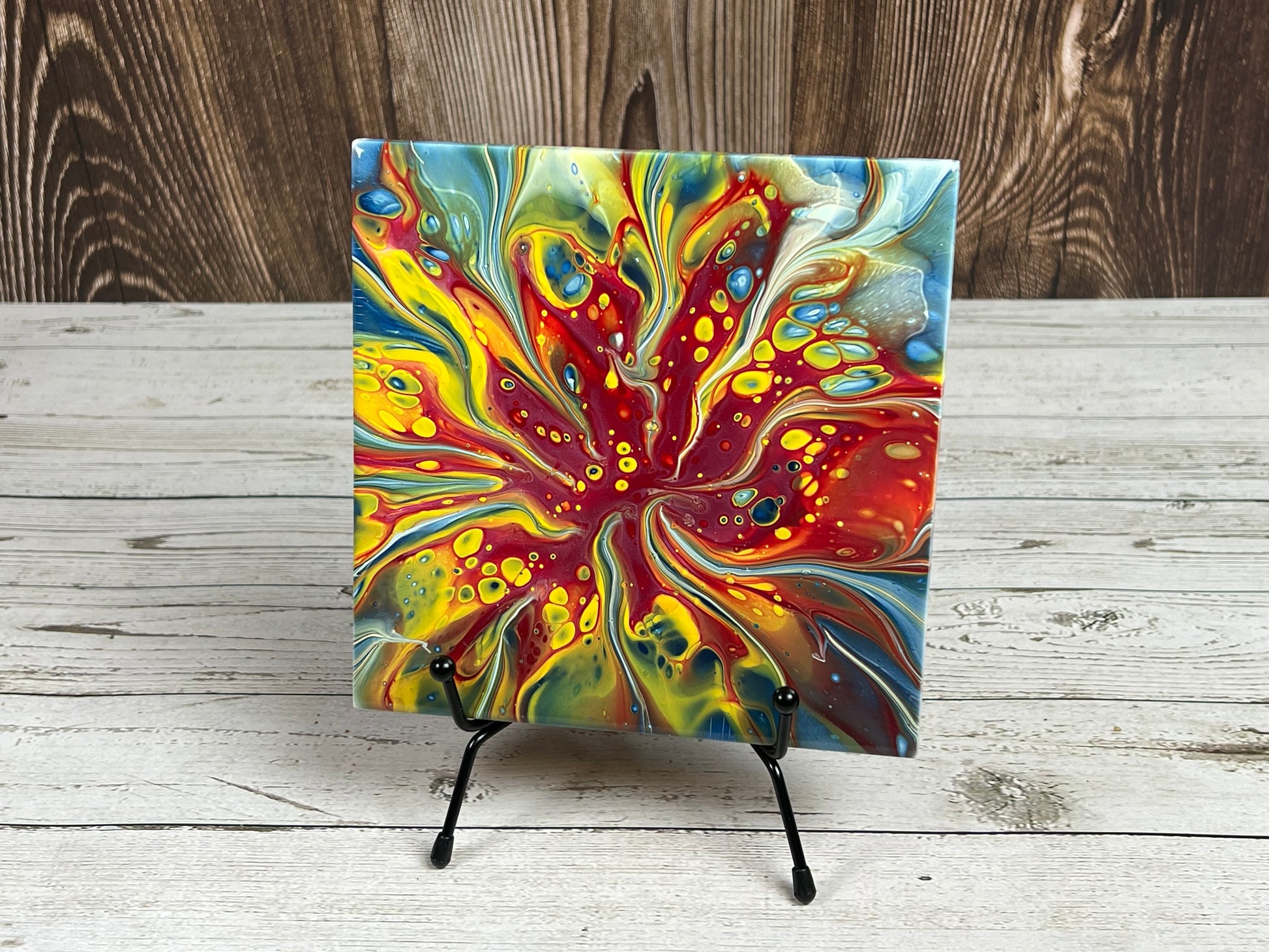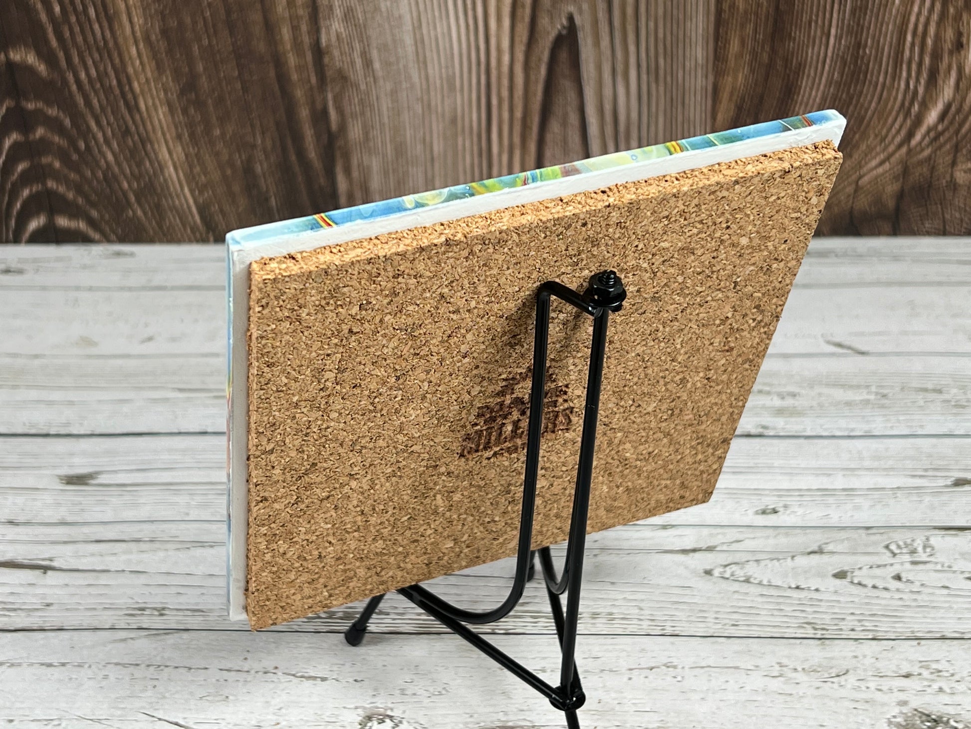 This handmade trivet is one-of-a-kind. It will bring a burst of color and elegance to any kitchen countertop, dining or end table. Excellent as a base for a plant, candle or vase, or you can simply display it with the included metal stand.