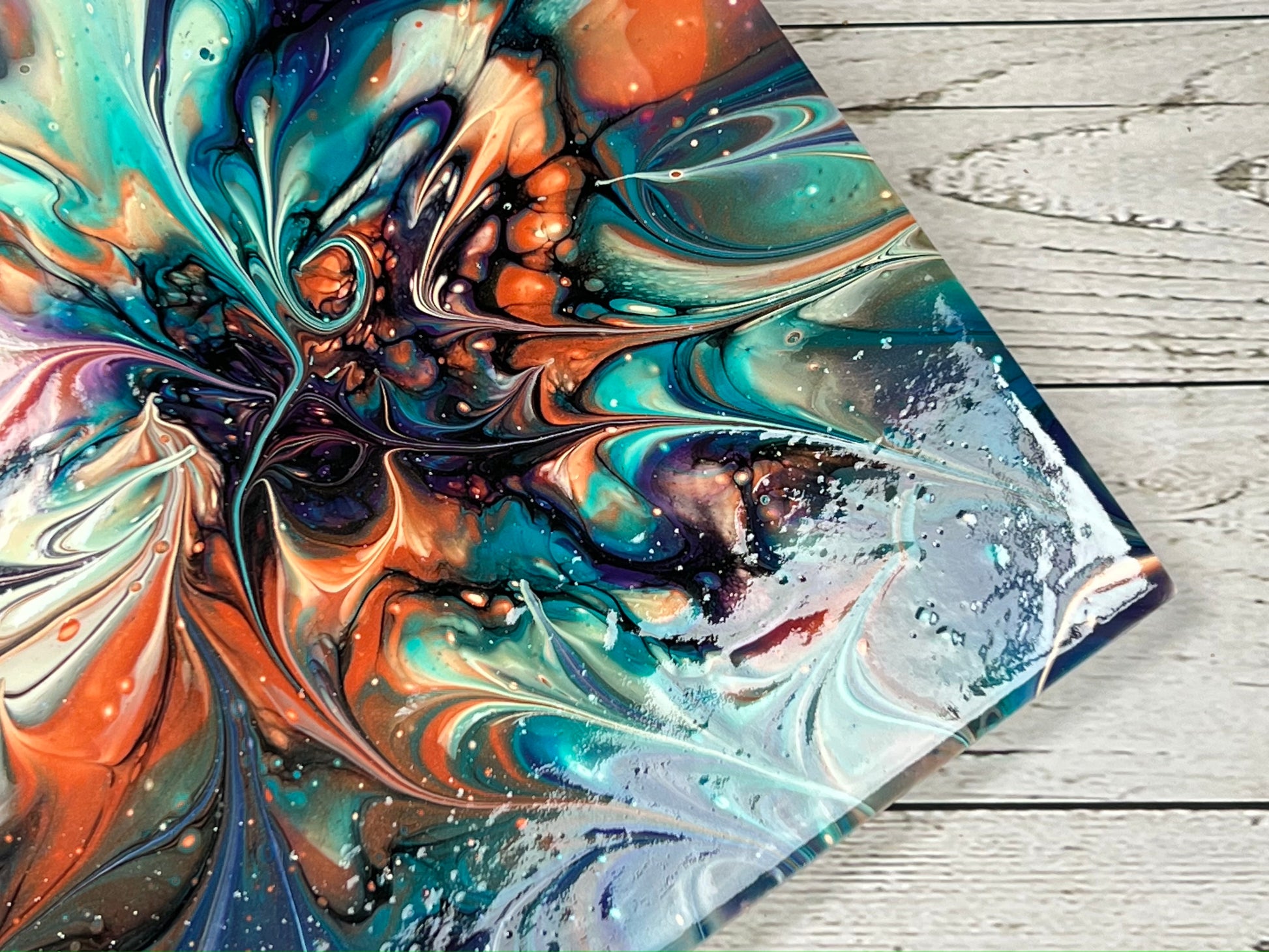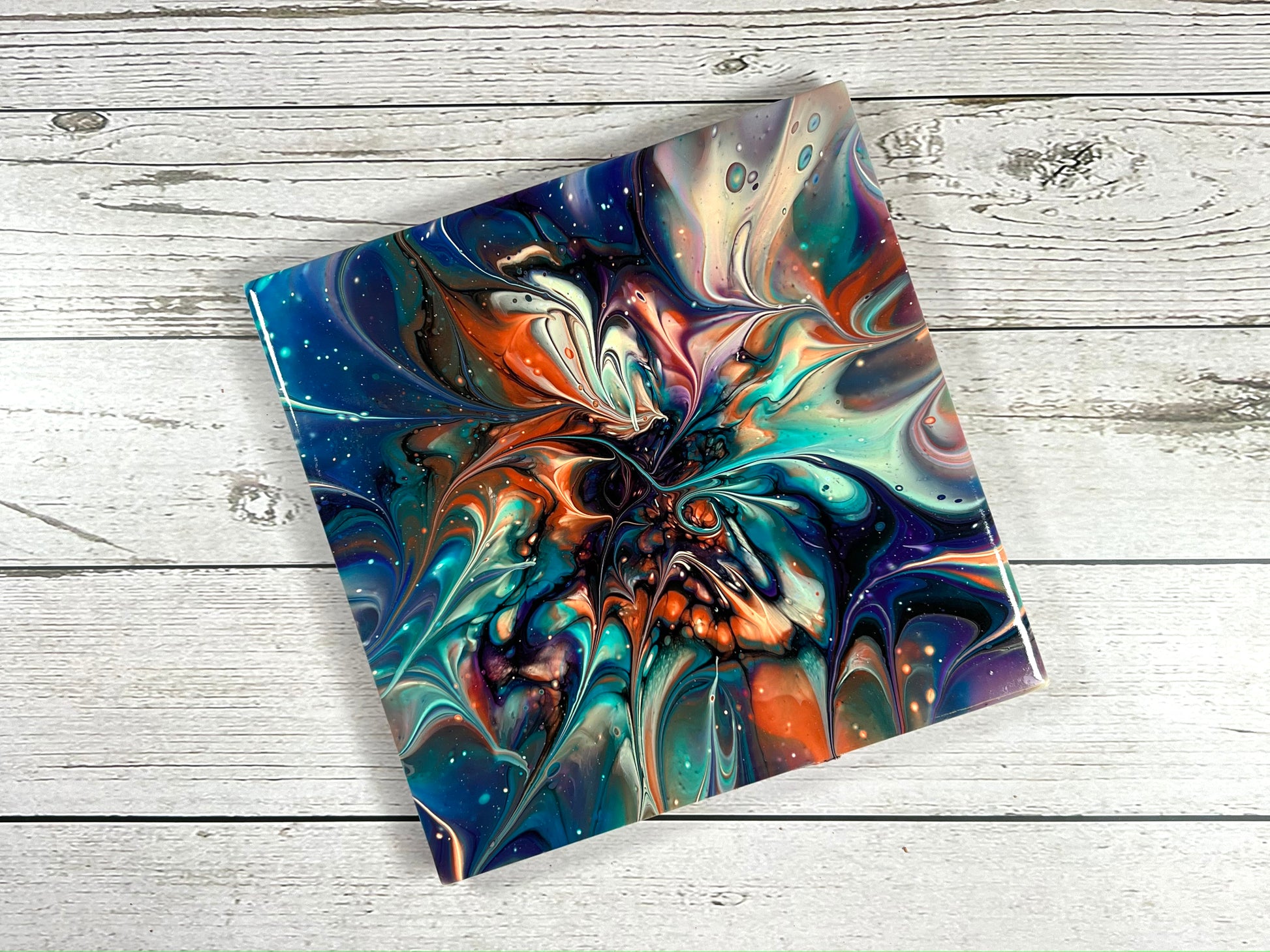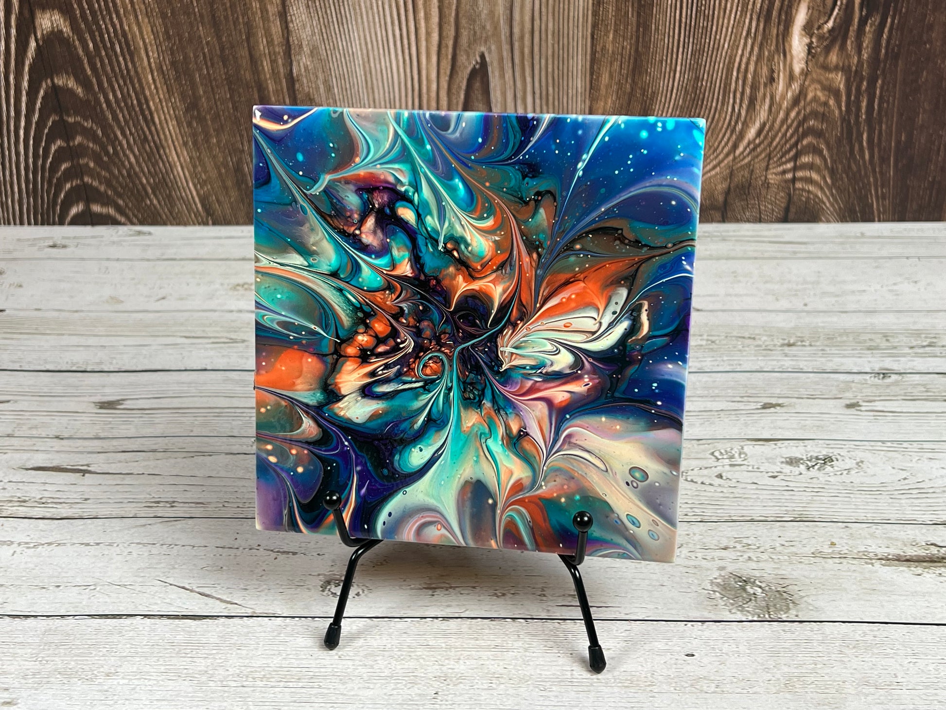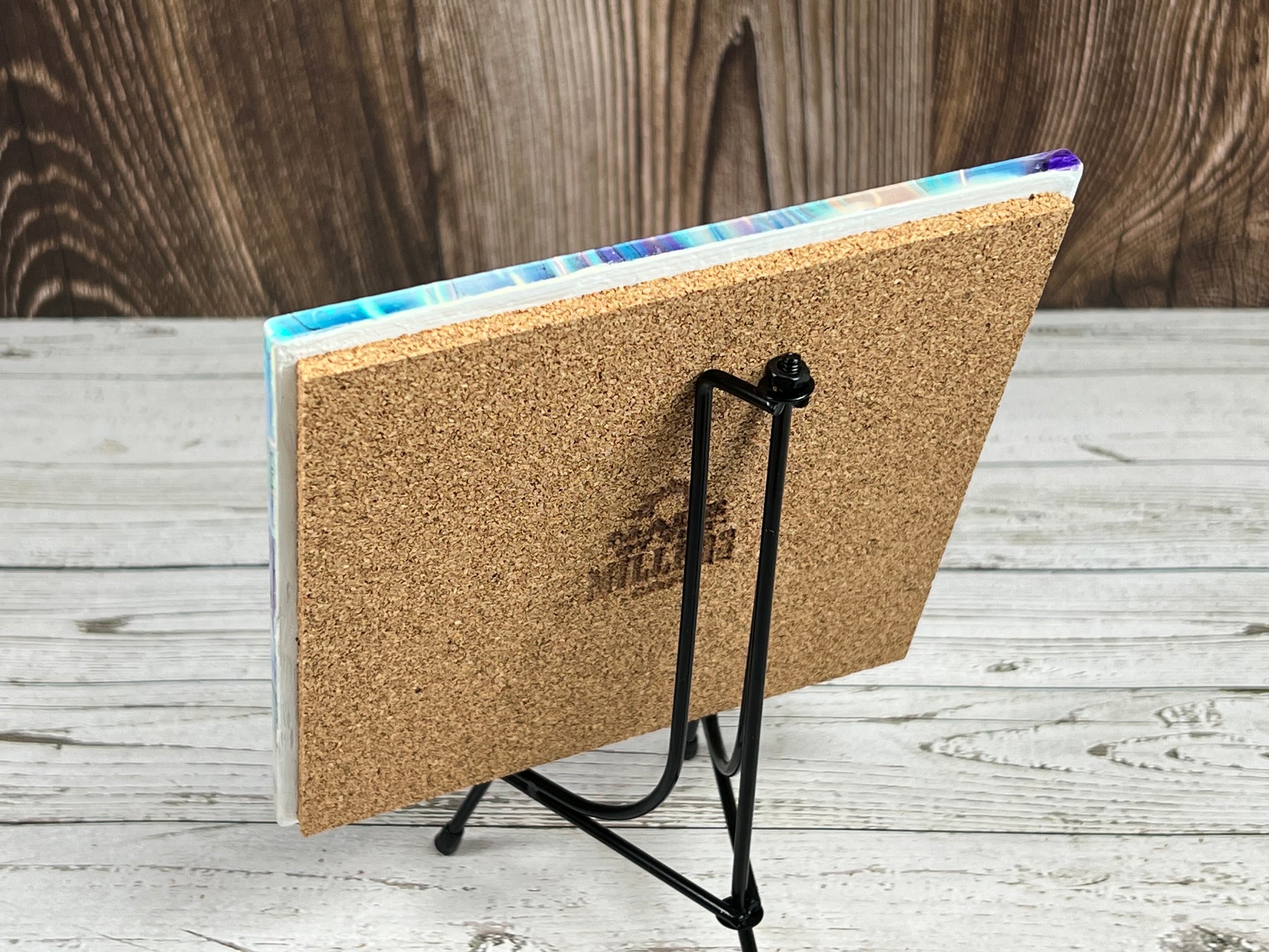 This handmade trivet is one-of-a-kind. It will bring a burst of color and elegance to any kitchen countertop, dining or end table. Excellent as a base for a plant, candle or vase, or you can simply display it with the included metal stand.