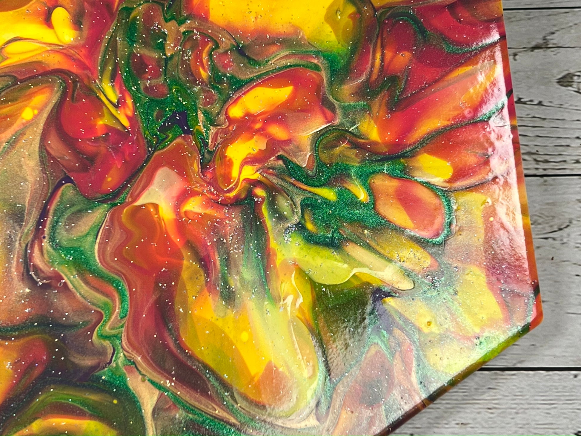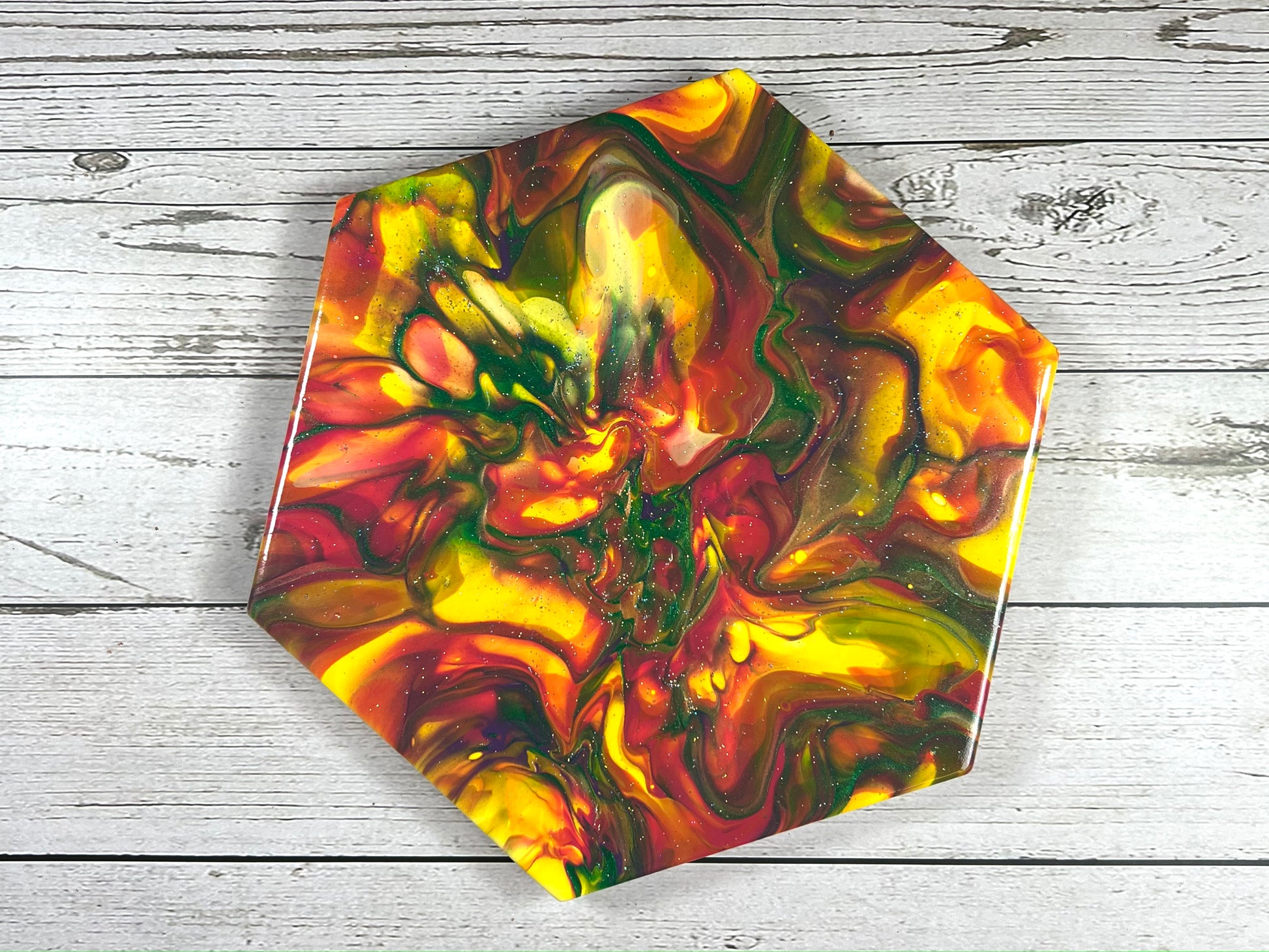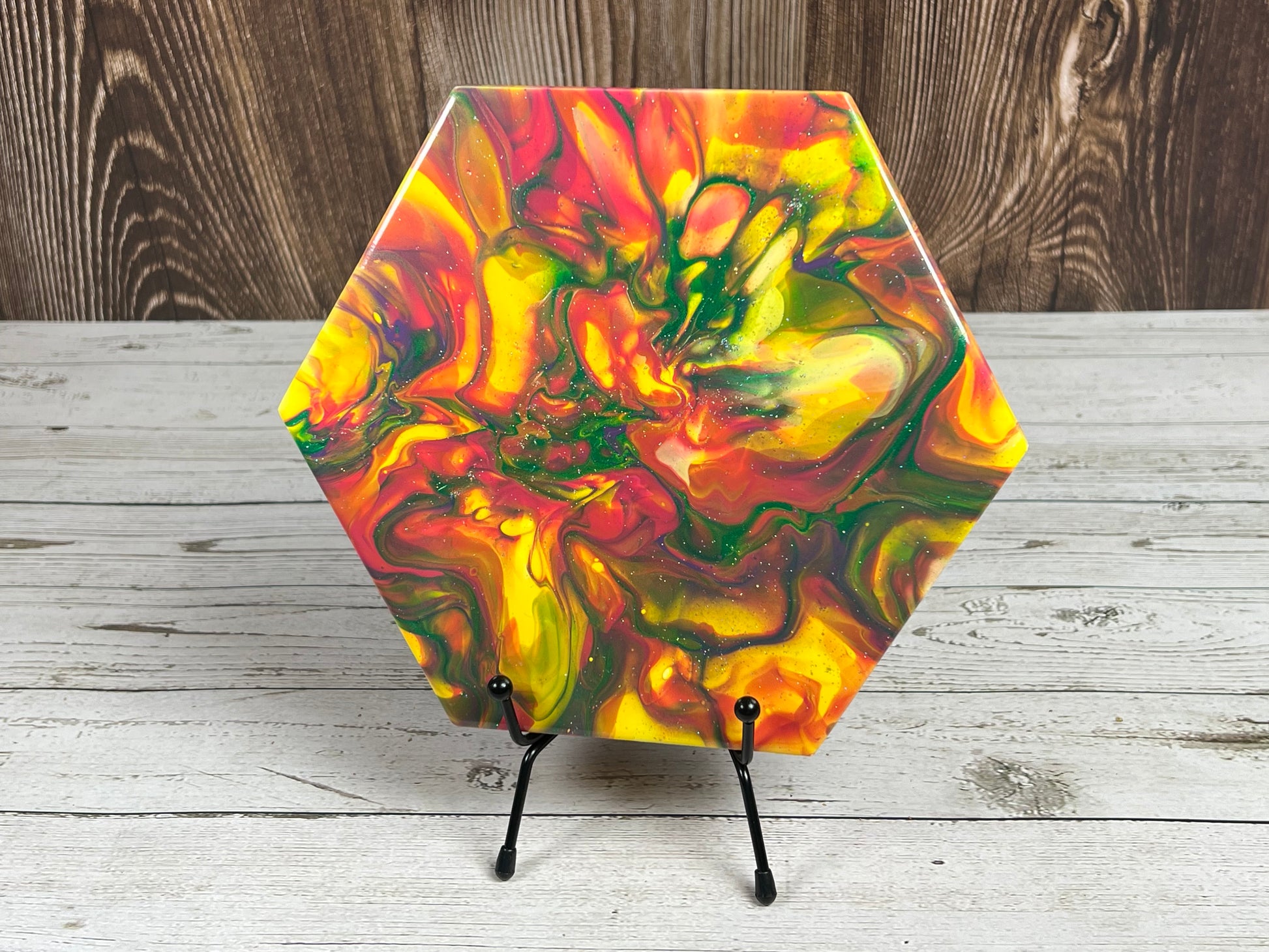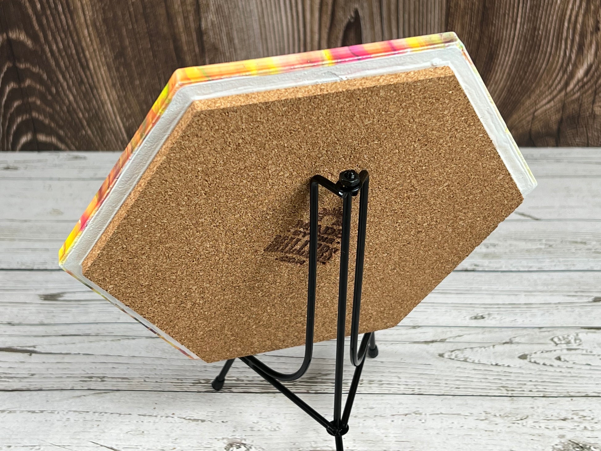 This handmade trivet is one-of-a-kind. It will bring a burst of color and elegance to any kitchen countertop, dining or end table. Excellent as a base for a plant, candle or vase, or you can simply display it with the included metal stand.