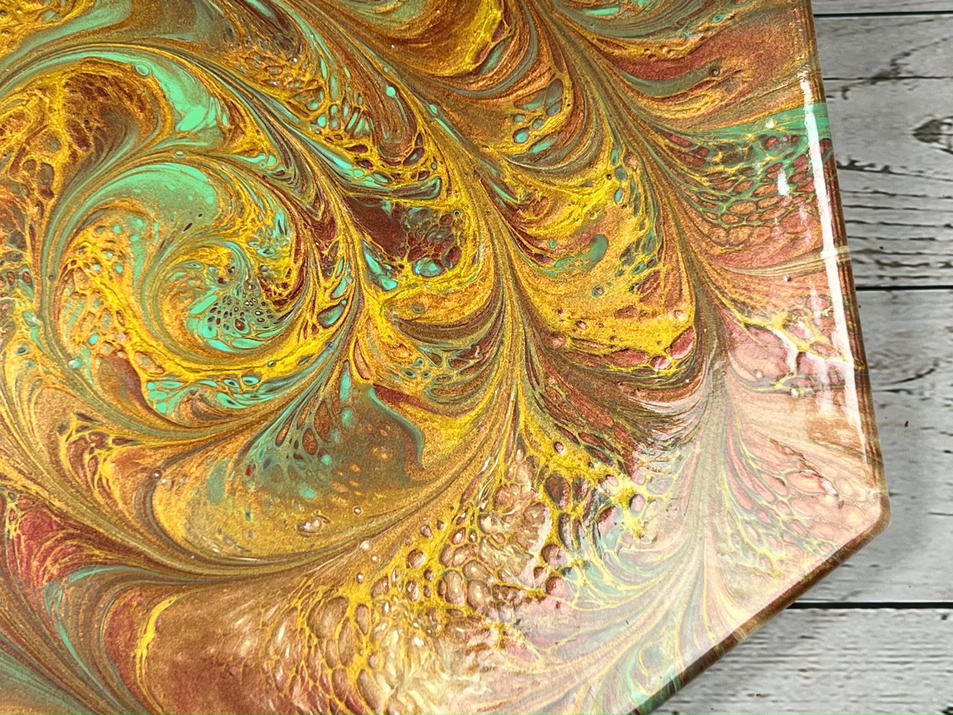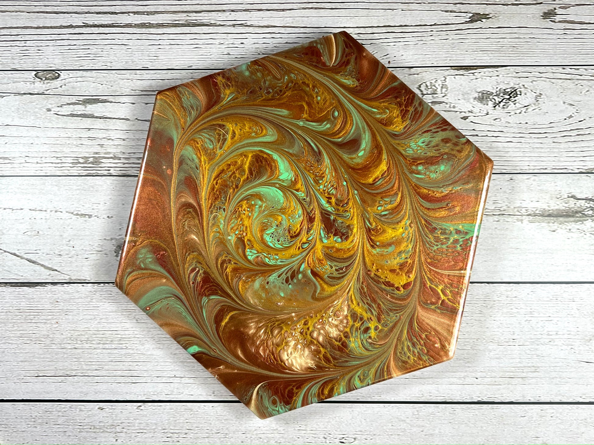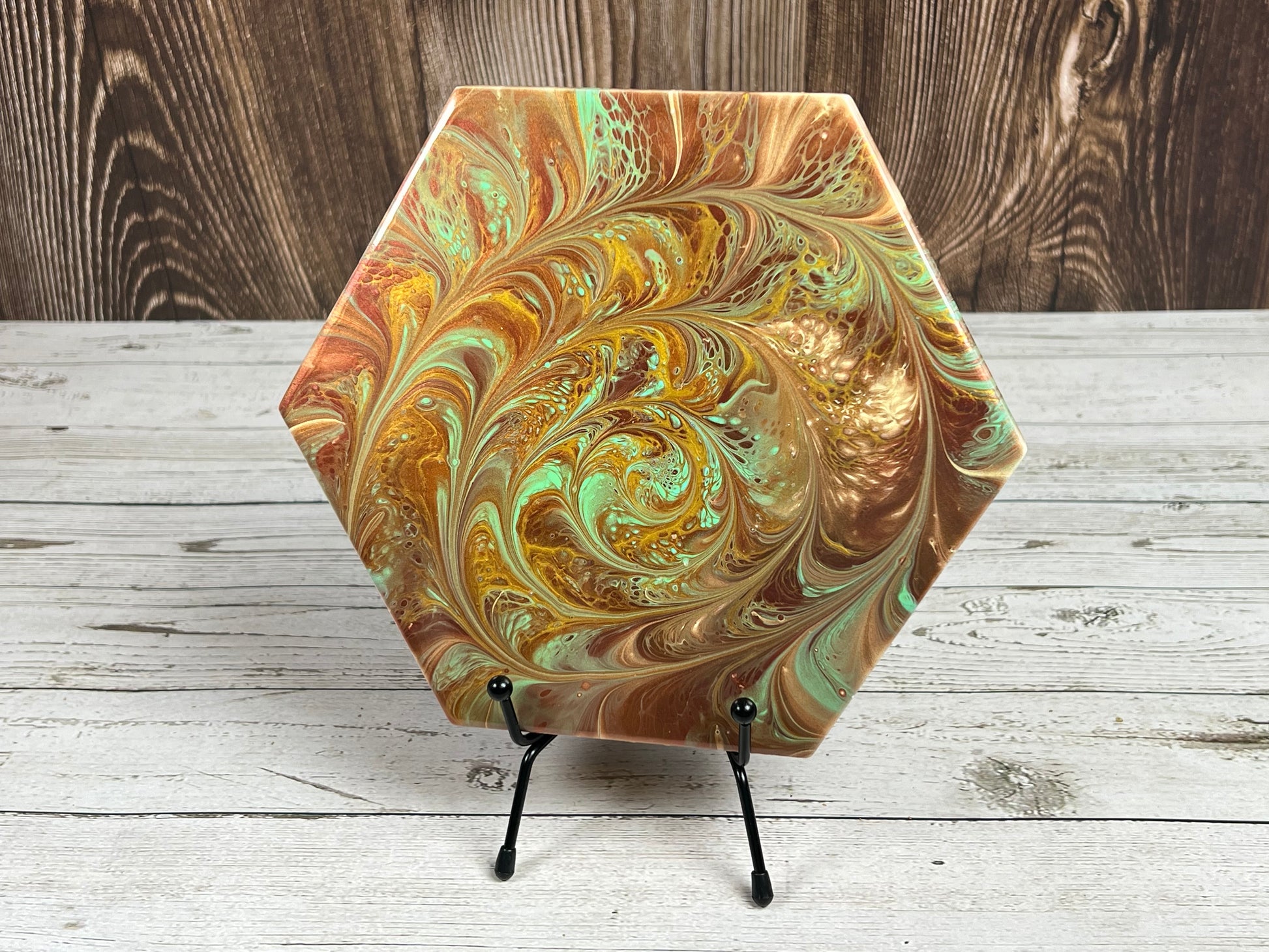 This handmade trivet is one-of-a-kind. It will bring a burst of color and elegance to any kitchen countertop, dining or end table. Excellent as a base for a plant, candle or vase, or you can simply display it with the included metal stand.